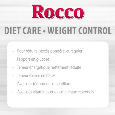 Les croquettes Rocco Diet Care Weight Control constituent un aliment diététique complet pour chien adulte.